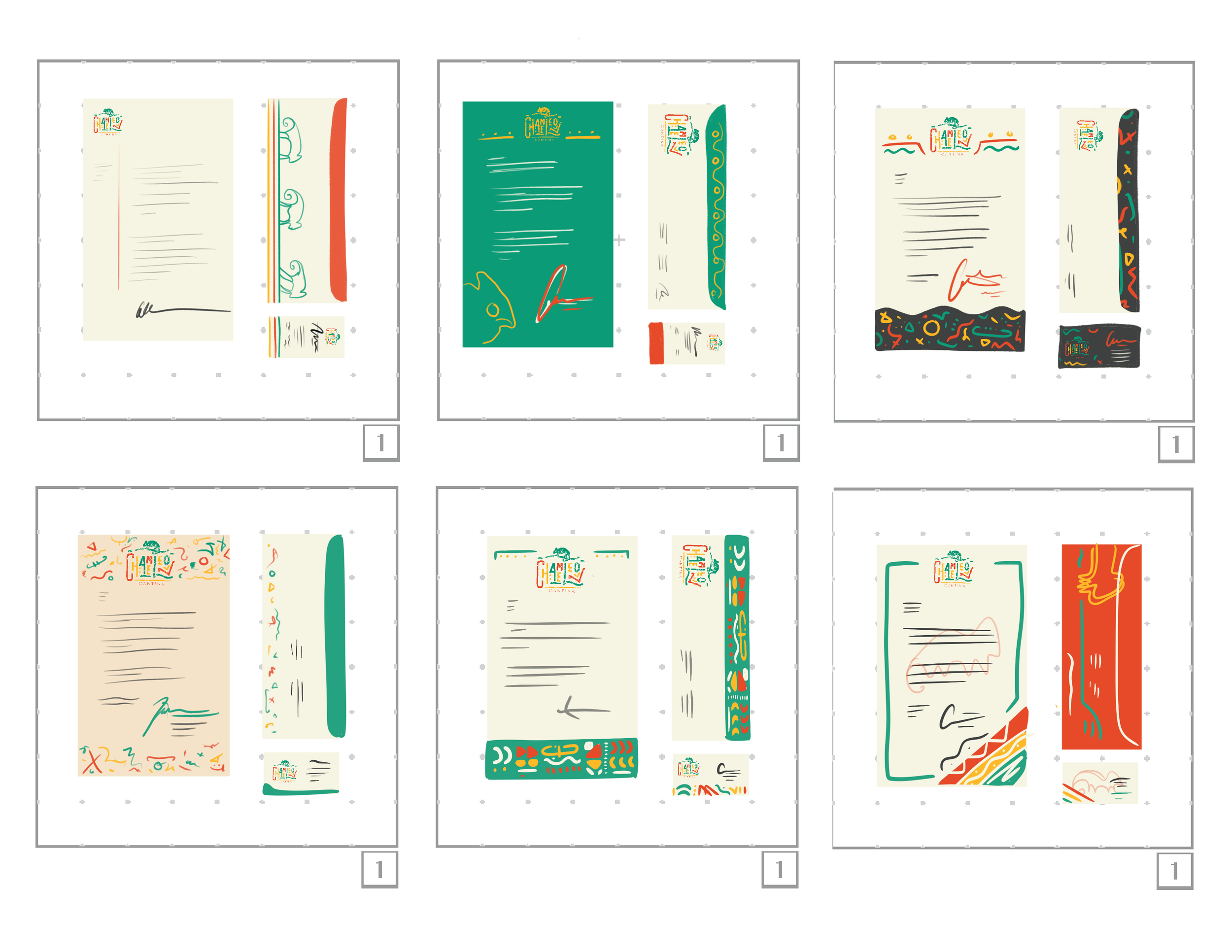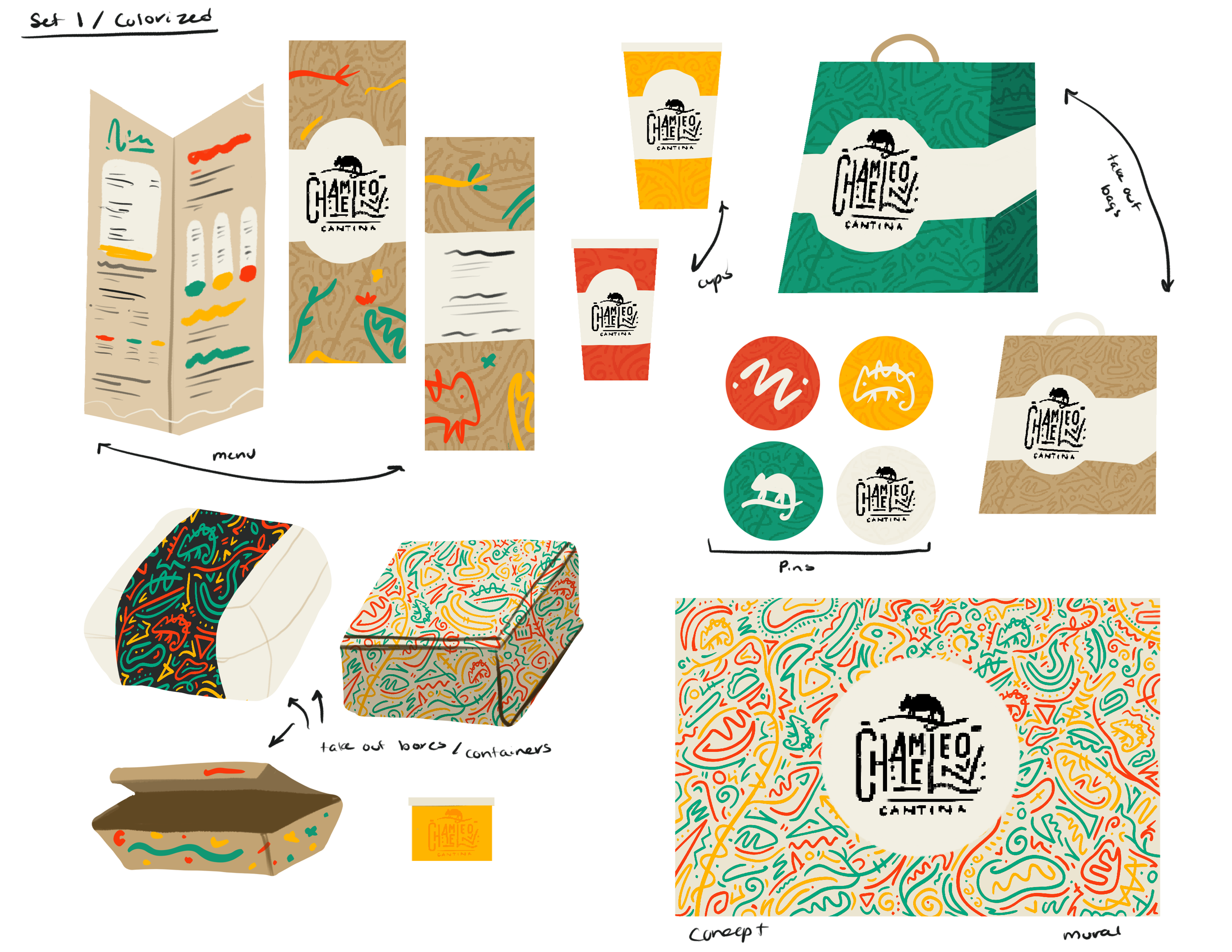After creating the designs, I added color to see what could work on different items like to-go cups, containers, hot sauce bottles, and fun packages. I took elements from both ideas and combined them into one concept. After consolidating the choices, I moved forward with the final catalog of items.