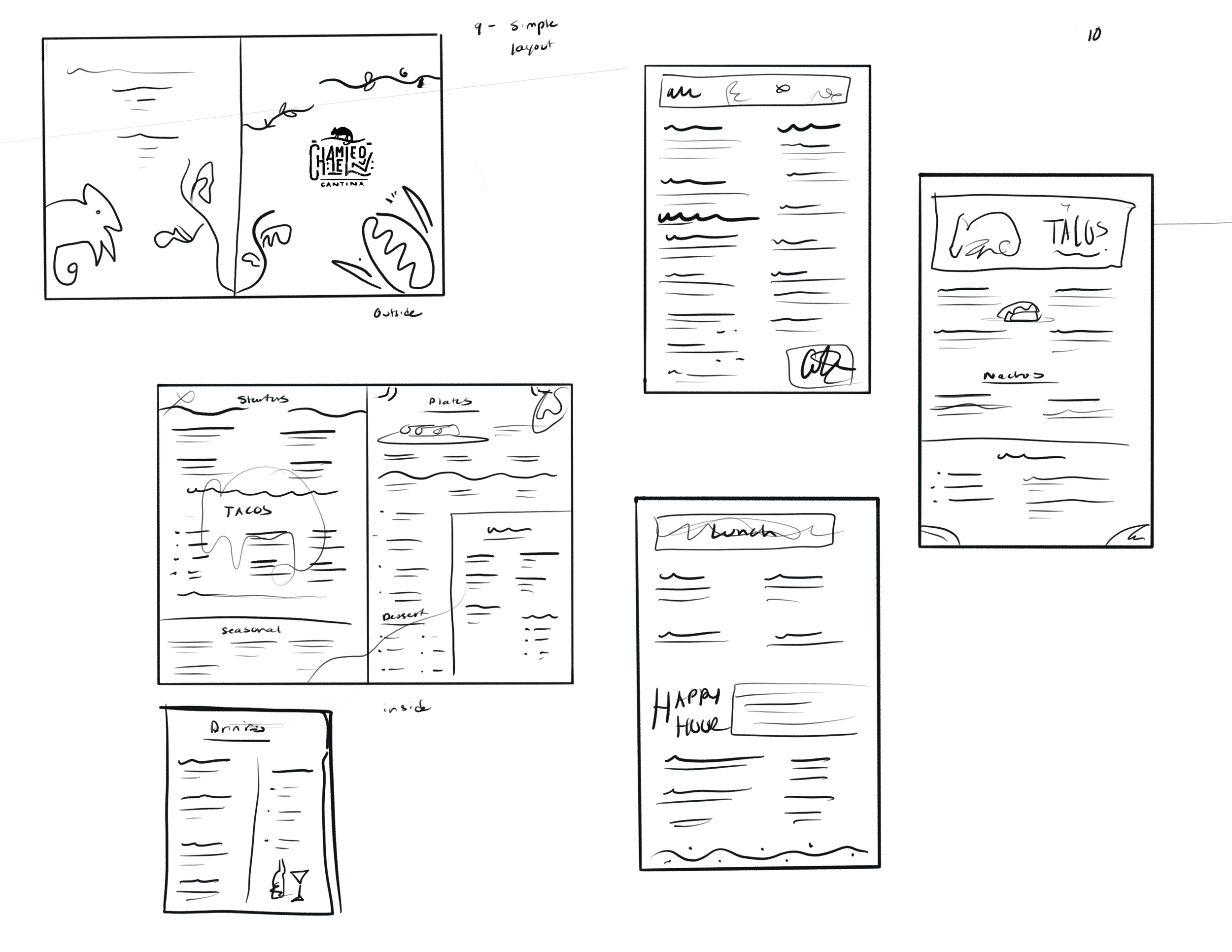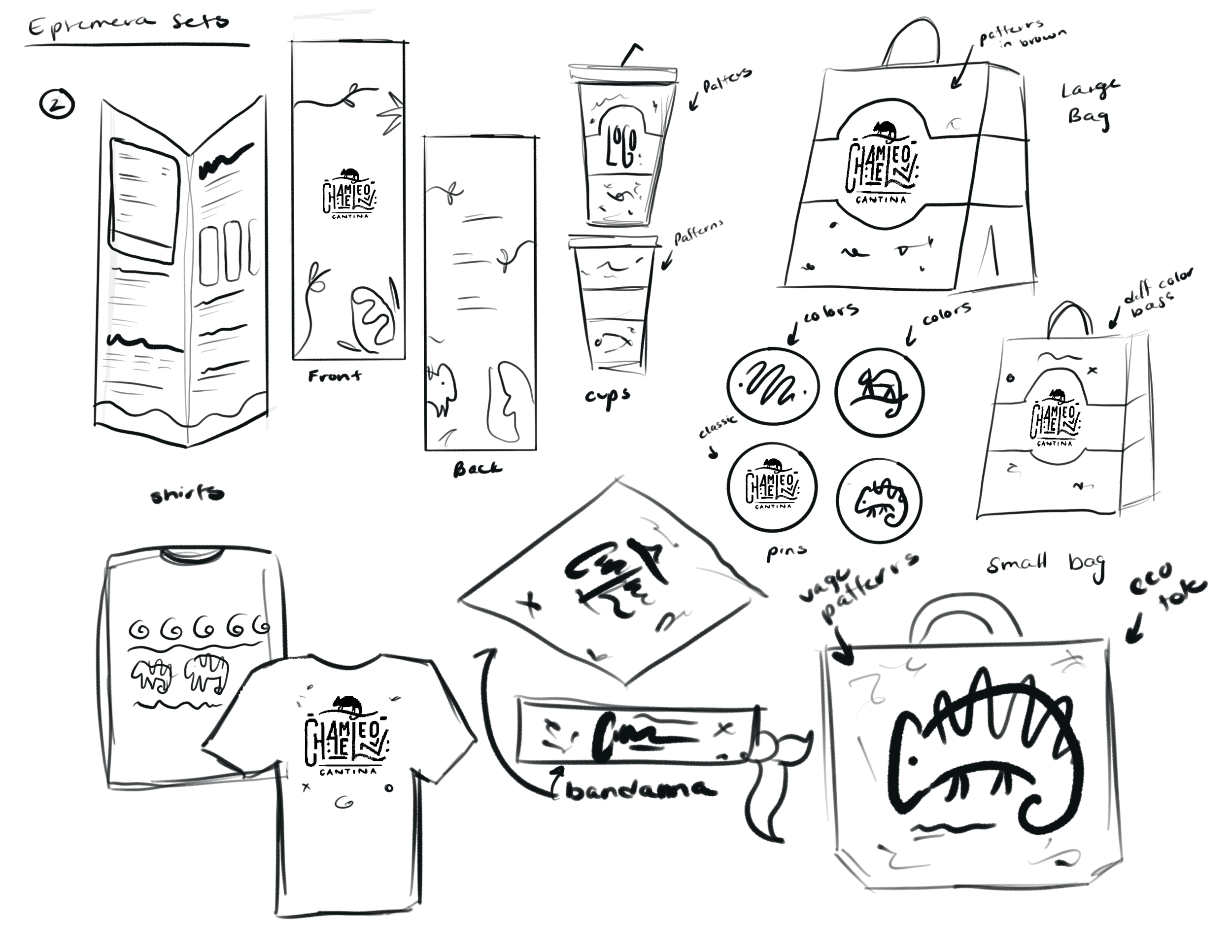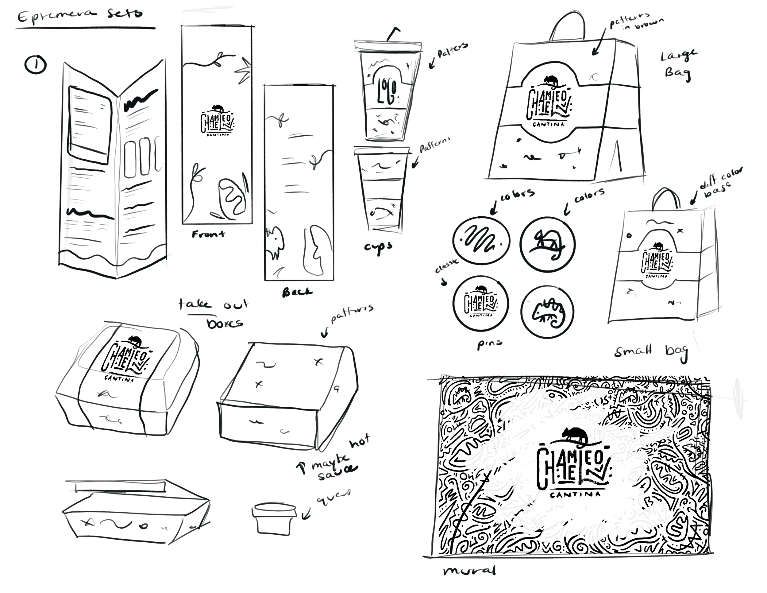 For one of my first projects in my final semester, I had the opportunity to create a visual branding identity project for a restaurant. We had to come up with different ideas for our theme for the restaurant, which included the type of cuisine, location, atmosphere, and audience. We started sketching some iterations for two of our strongest ideas and moved forward with one. The concept I moved forward with was a Tex-Mex theme with a chameleon as the primary imagery.