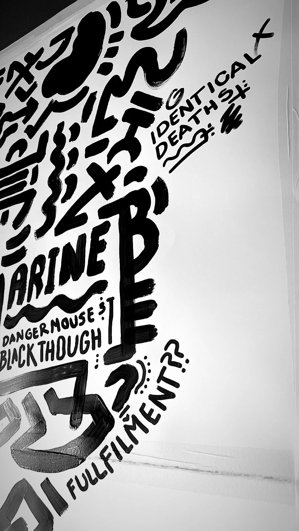 I had that down. The next approach I took was utilizing sources of inspiration. I had songs, albums, lyrics, caricatures, quotes, thoughts - anything I stored was up for grabs. Two albums heavily influenced this mural: Cheat Codes by Danger Mouse and Black Thought, and Chris Black Changed My Life by Portugal. The Man